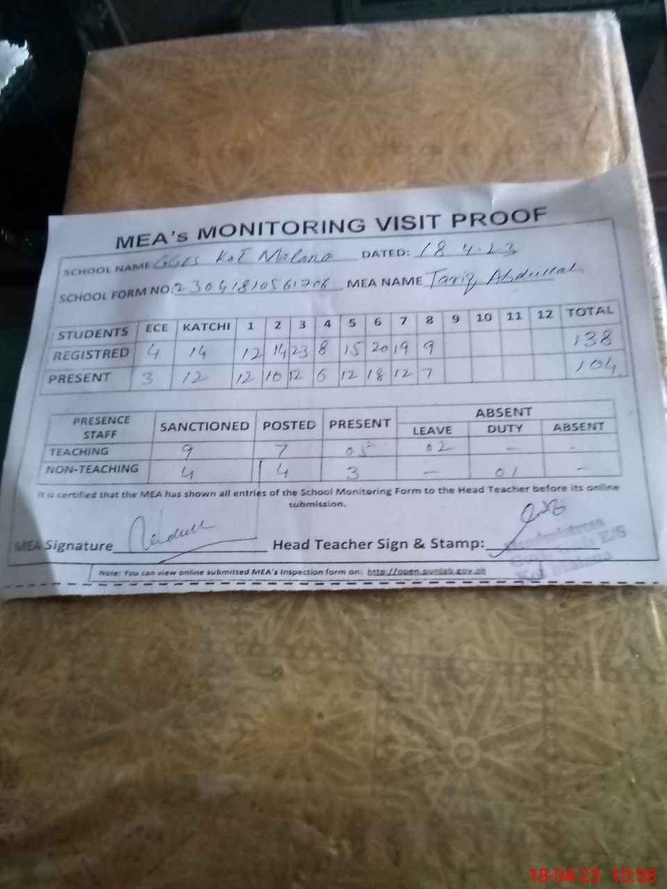 | Attendance Register | Head Teacher | MEA with School | Visit Proof |