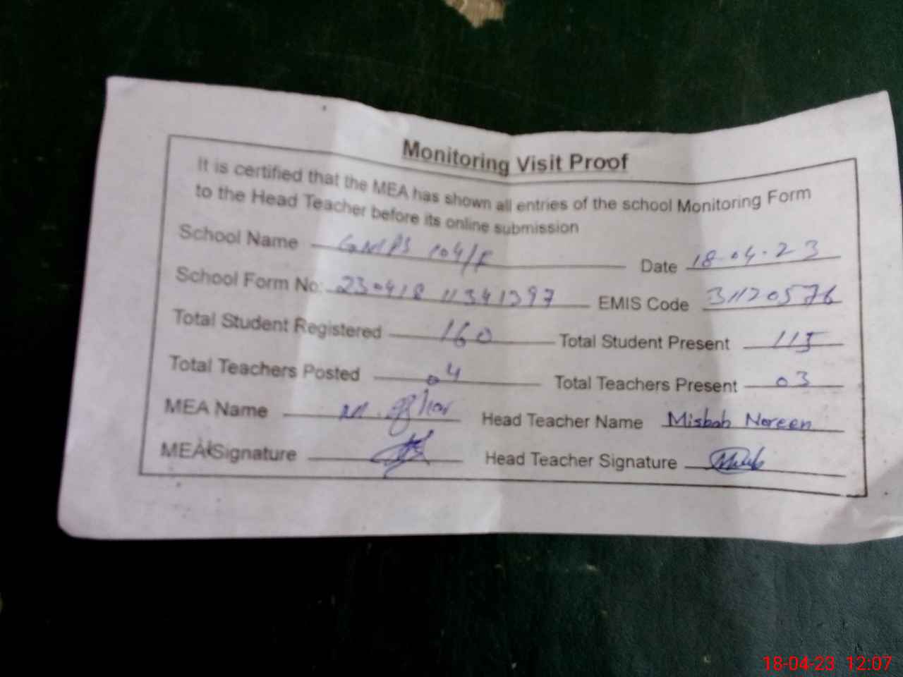 | EMIS Code: 31120576 | Name of School: GGPS CHAK NO. 104/F | |||