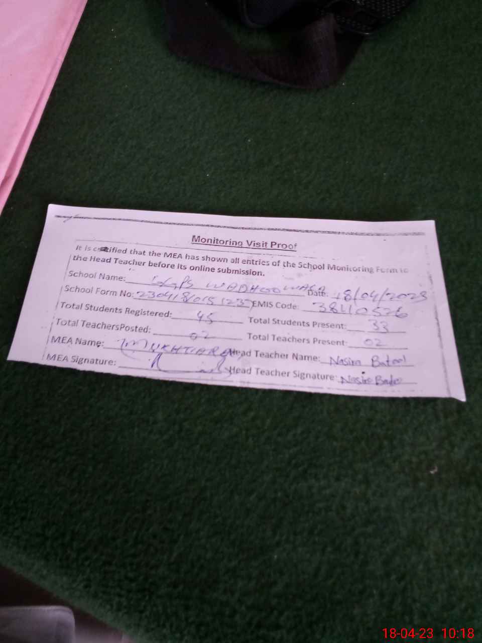 | Attendance Register | Head Teacher | MEA with School | Visit Proof |