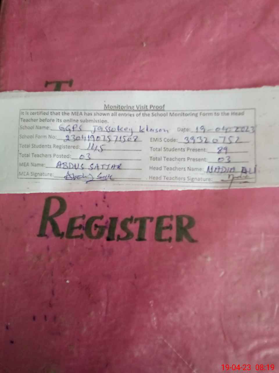 | Attendance Register | Head Teacher | MEA with School | Visit Proof |