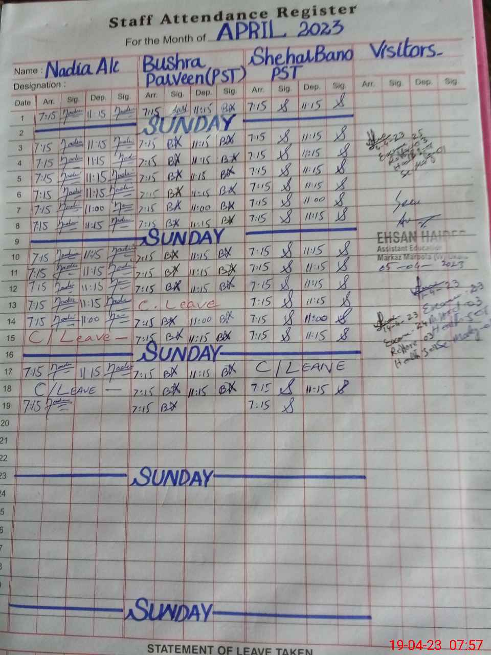 | CNIC | Full Name | Designation | R/C | Absence During Last Calender Month |