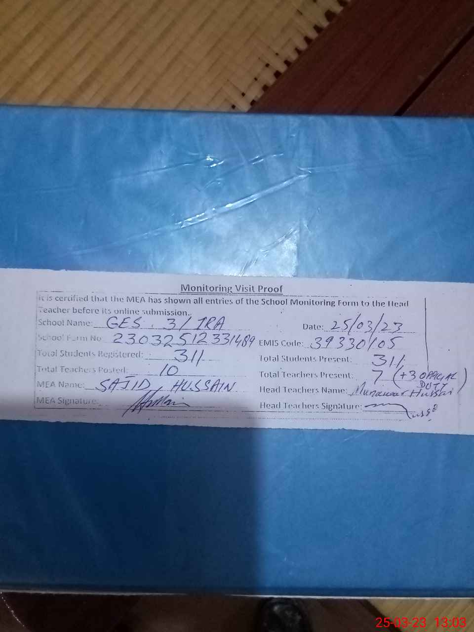 | EMIS Code: 39330105 | Name of School: GES CHAK NO. 3/1-RA | |||