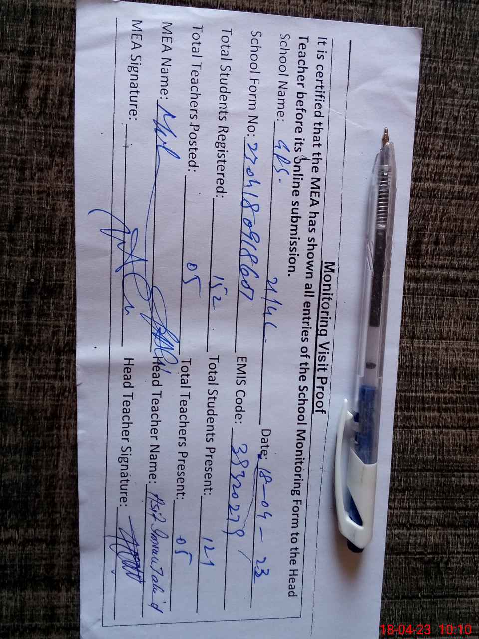 | Attendance Register | Head Teacher | MEA with School | Visit Proof |