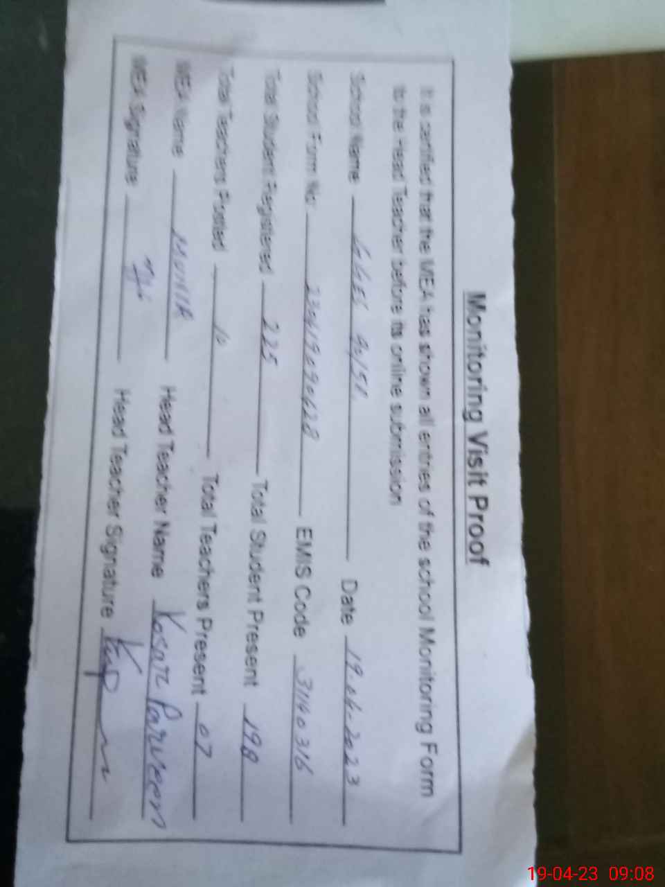 | Attendance Register | Head Teacher | MEA with School | Visit Proof |