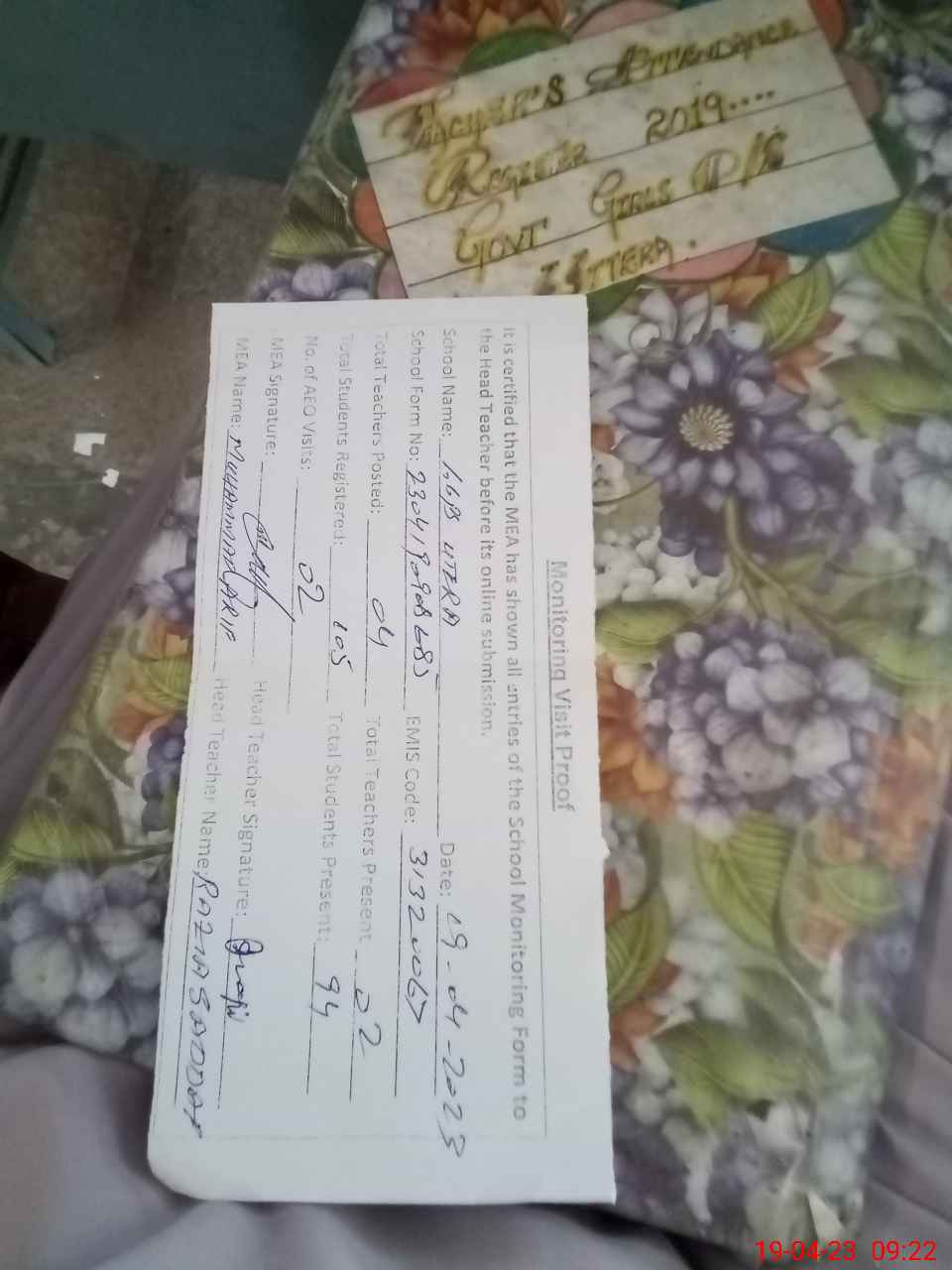 | Attendance Register | Head Teacher | MEA with School | Visit Proof |