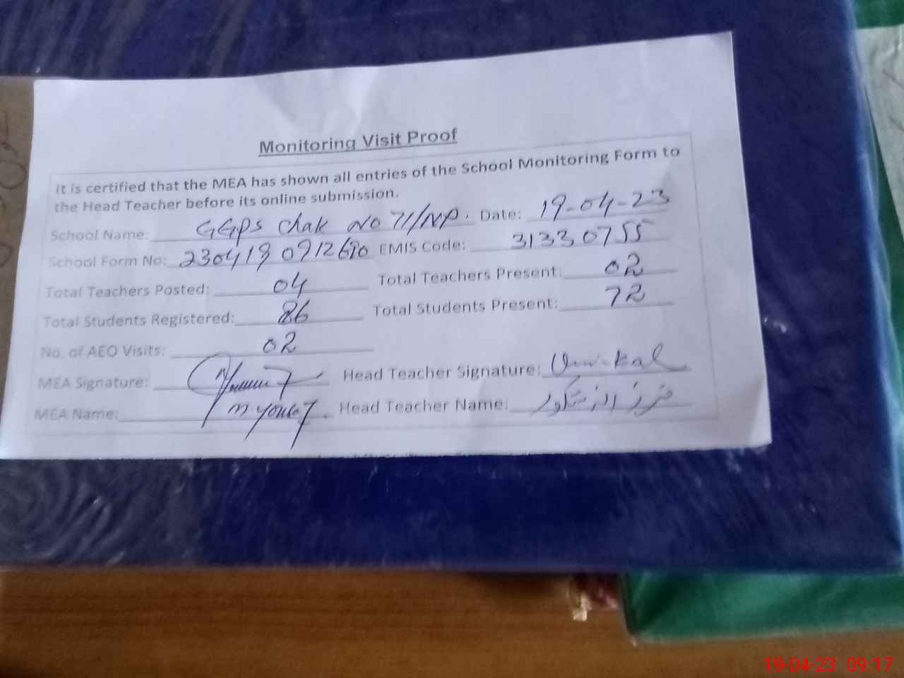 | Attendance Register | Head Teacher | MEA with School | Visit Proof |