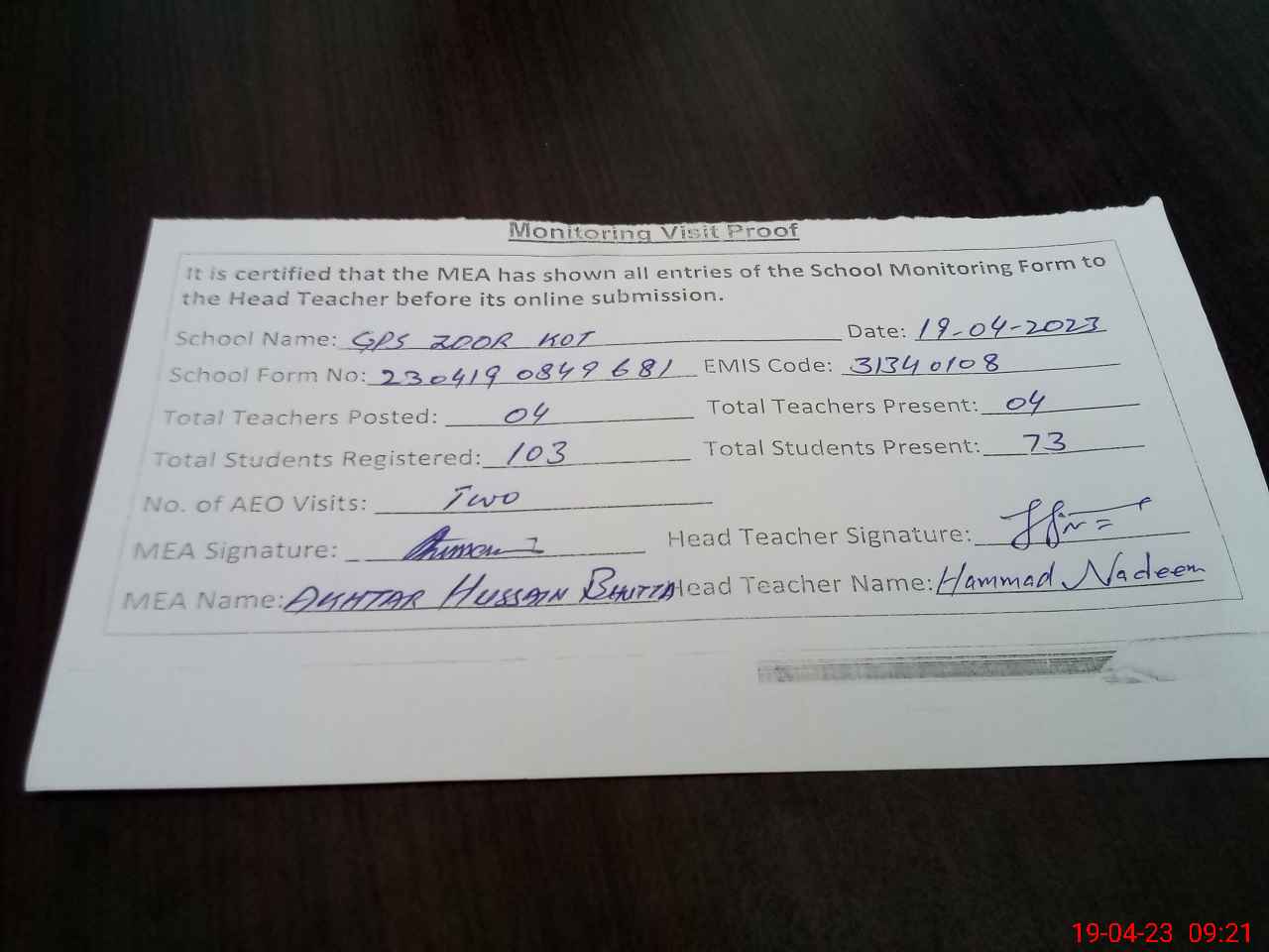 | Attendance Register | Head Teacher | MEA with School | Visit Proof |
