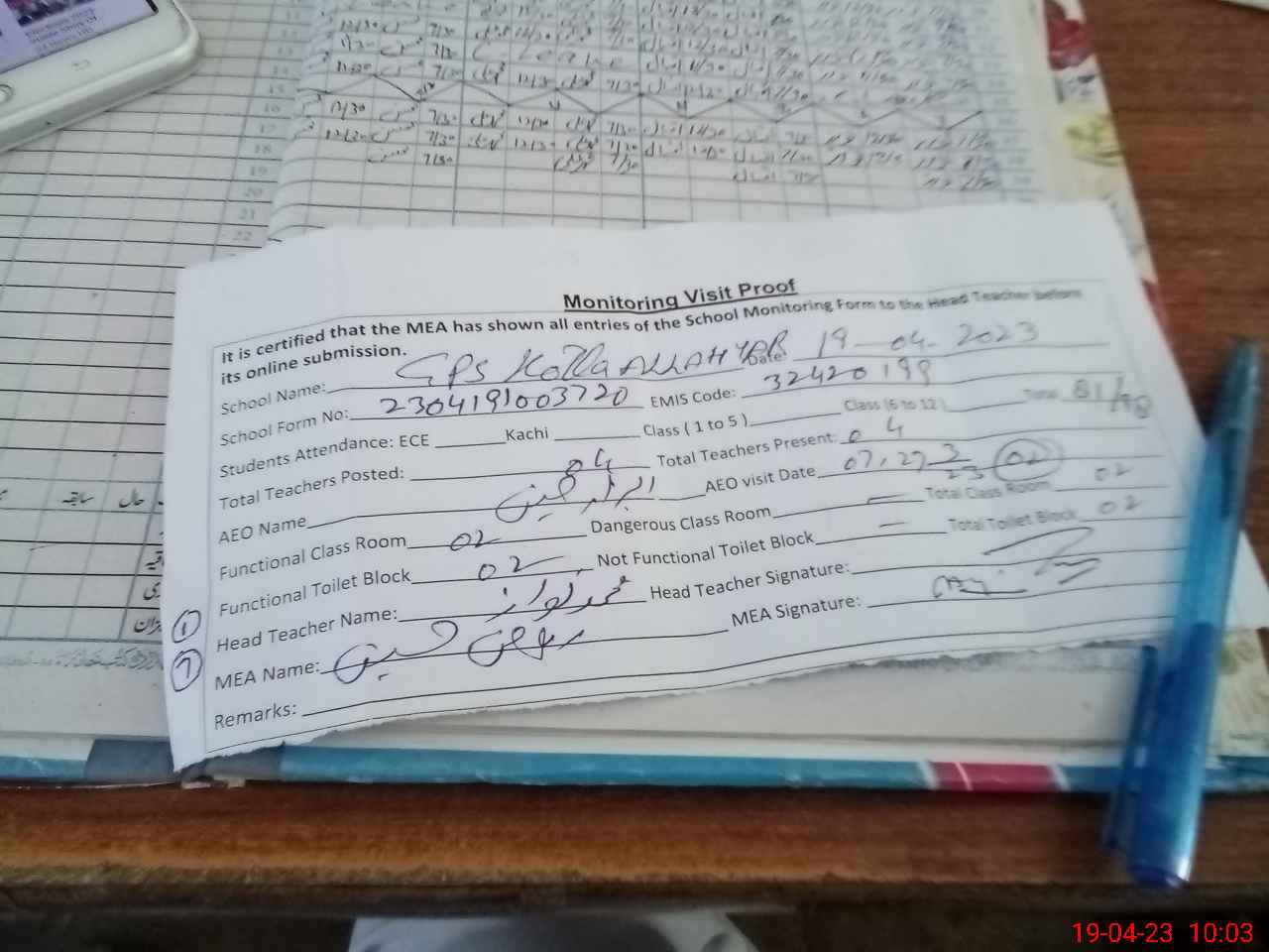 | Attendance Register | Head Teacher | MEA with School | Visit Proof |
