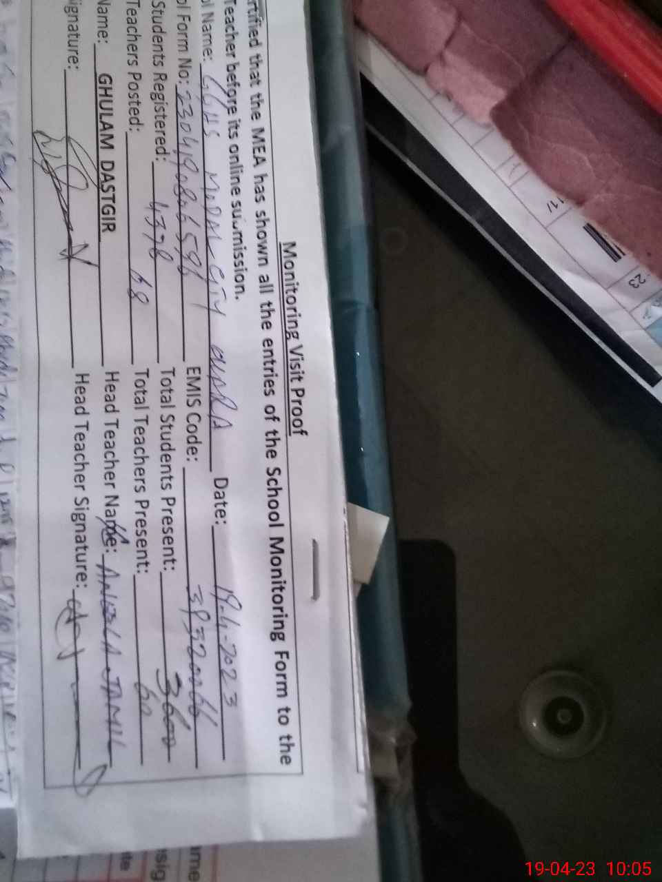 | Attendance Register | Head Teacher | MEA with School | Visit Proof |