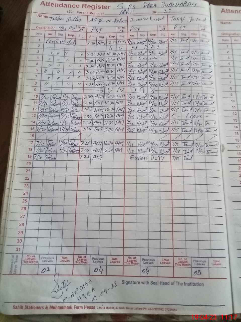 | Leave | Duty | Absent | Maternity | Medical | Ex- Pak |