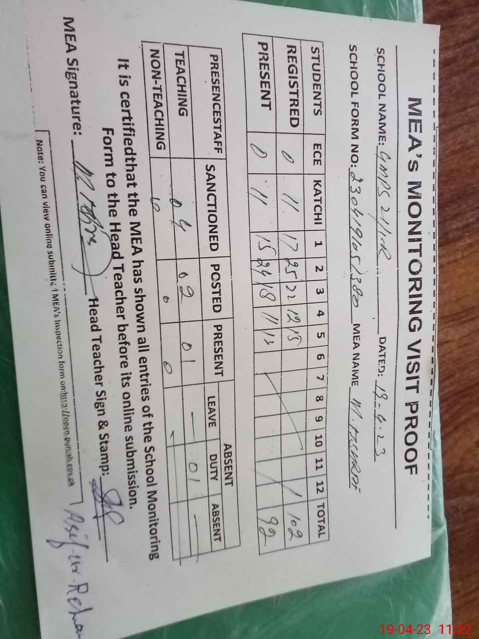 | Attendance Register | Head Teacher | MEA with School | Visit Proof |