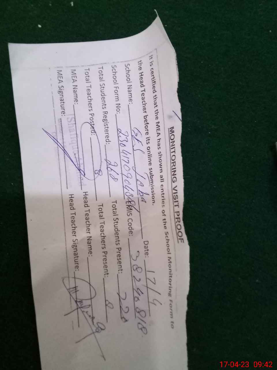 | Attendance Register | Head Teacher | MEA with School | Visit Proof |