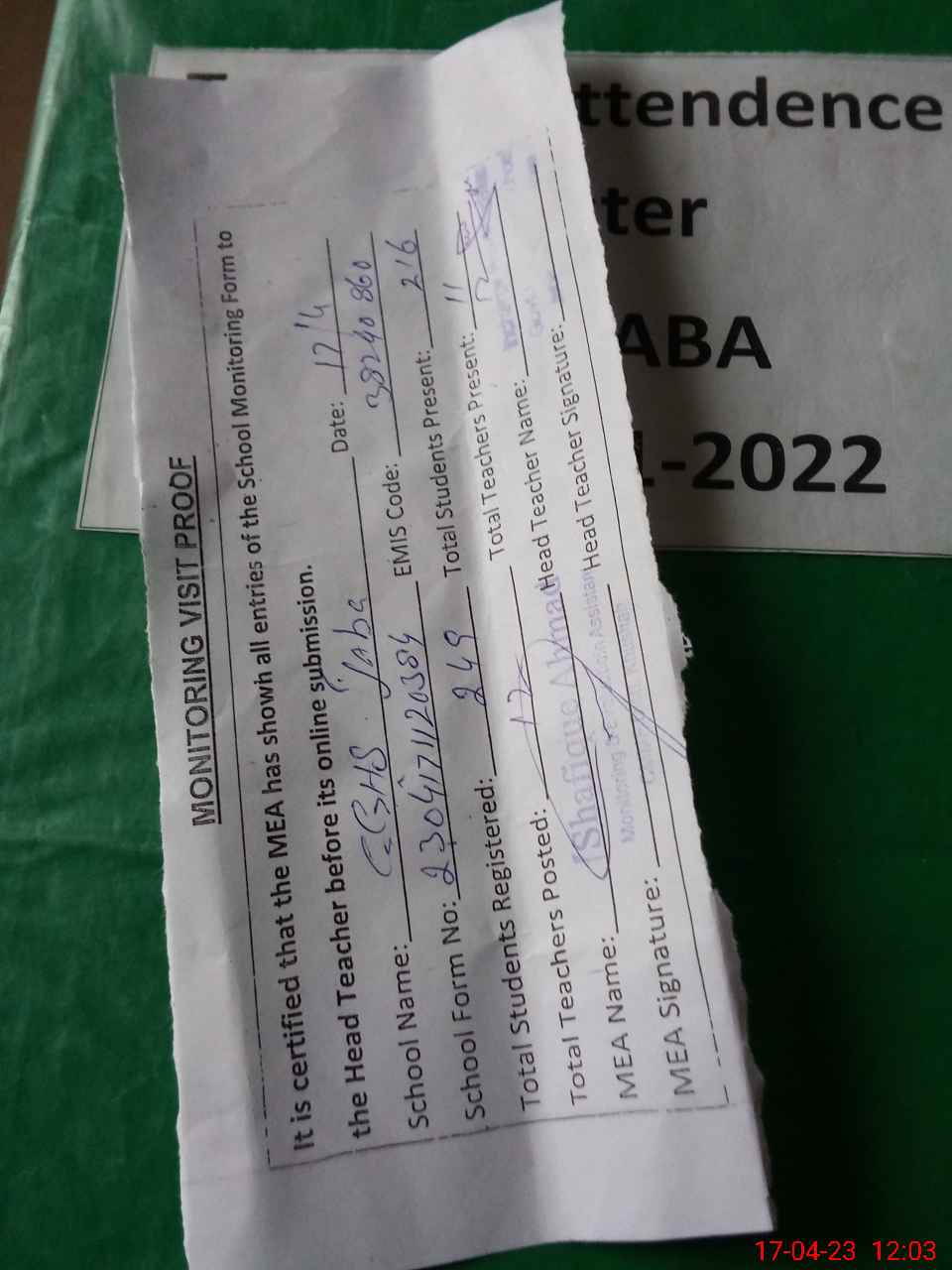 | Attendance Register | Head Teacher | MEA with School | Visit Proof |