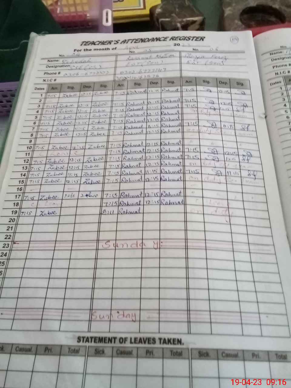 | CNIC | Full Name | Designation | R/C | Absence During Last Calender Month |
