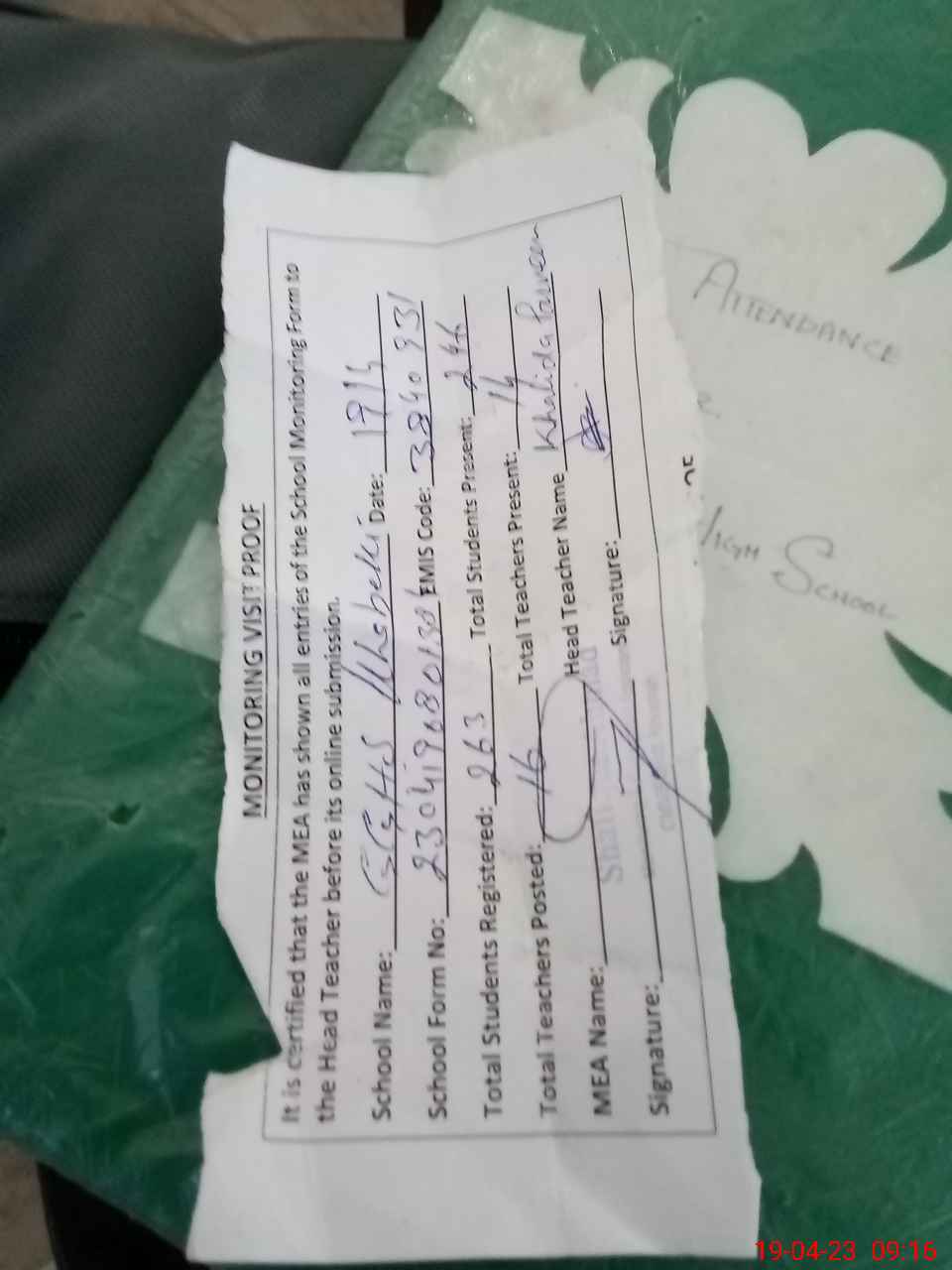 | Attendance Register | Head Teacher | MEA with School | Visit Proof |
