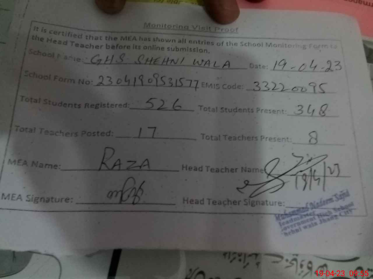 | EMIS Code: 33220095 | Name of School: GHS SHEHNI WALA | |||