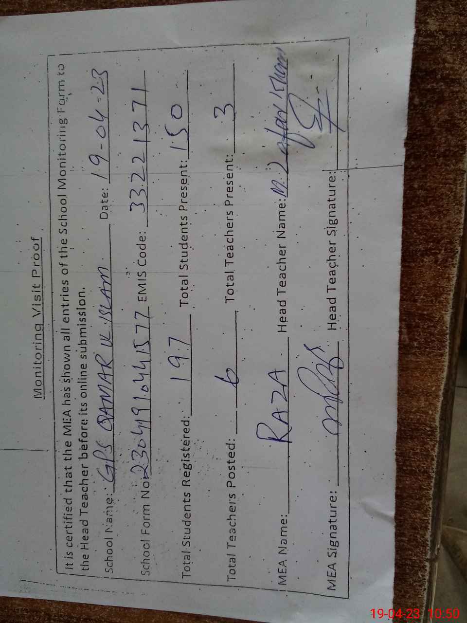 | Attendance Register | Head Teacher | MEA with School | Visit Proof |