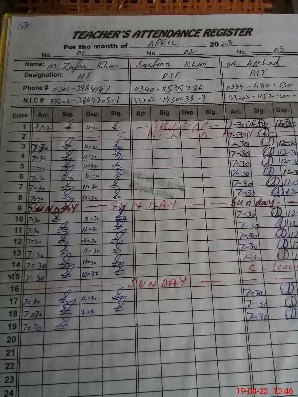 | CNIC | Full Name | Designation | R/C | Absence During Last Calender Month |