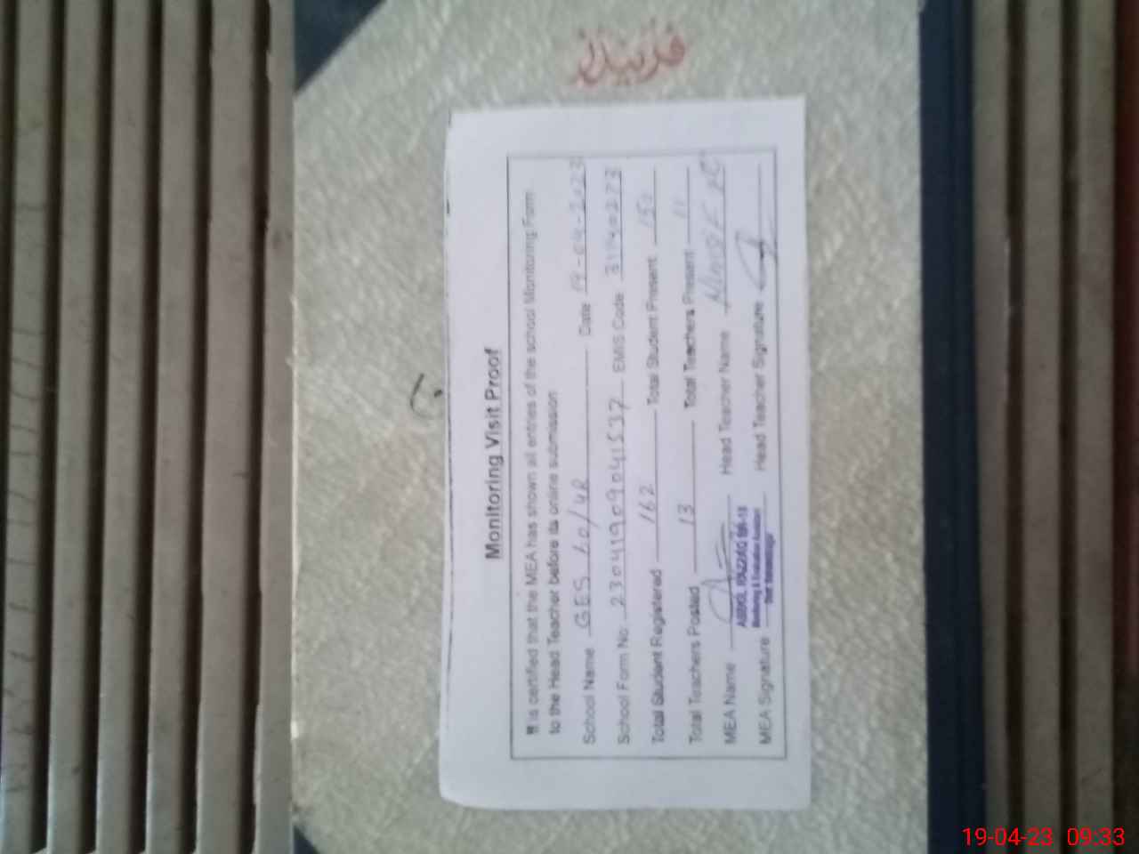 | Attendance Register | Head Teacher | MEA with School | Visit Proof |