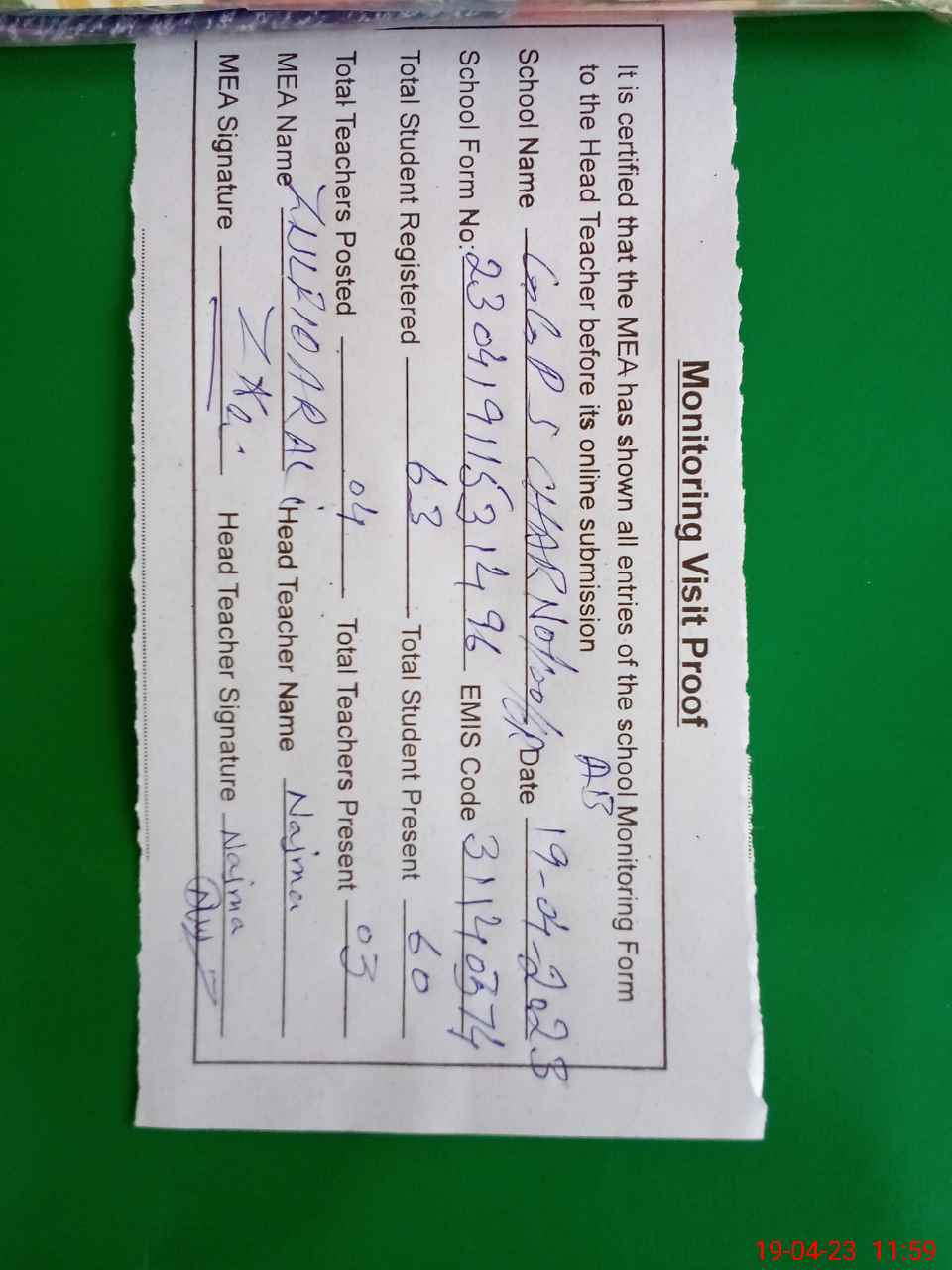 | Attendance Register | Head Teacher | MEA with School | Visit Proof |