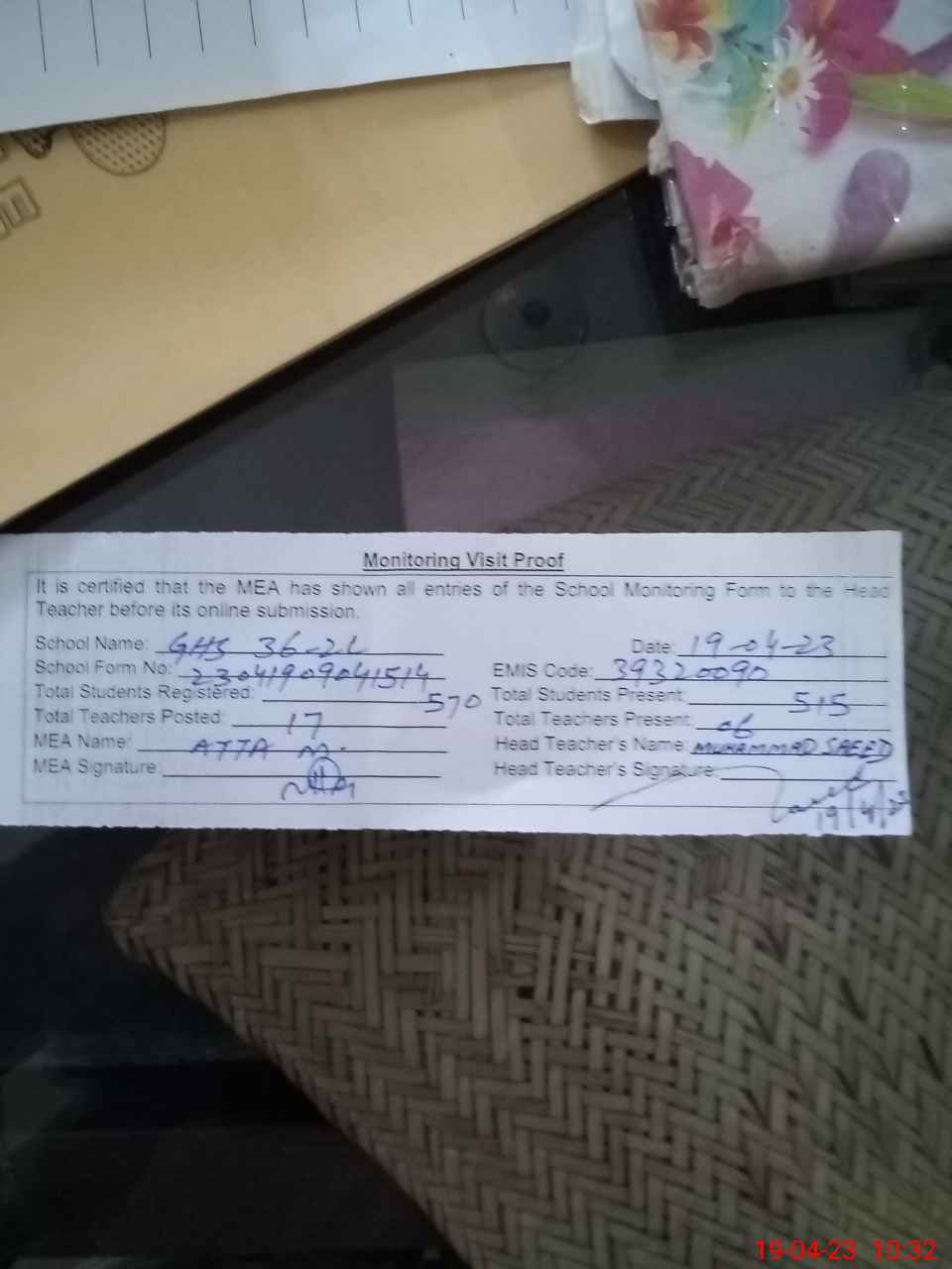 | Attendance Register | Head Teacher | MEA with School | Visit Proof |