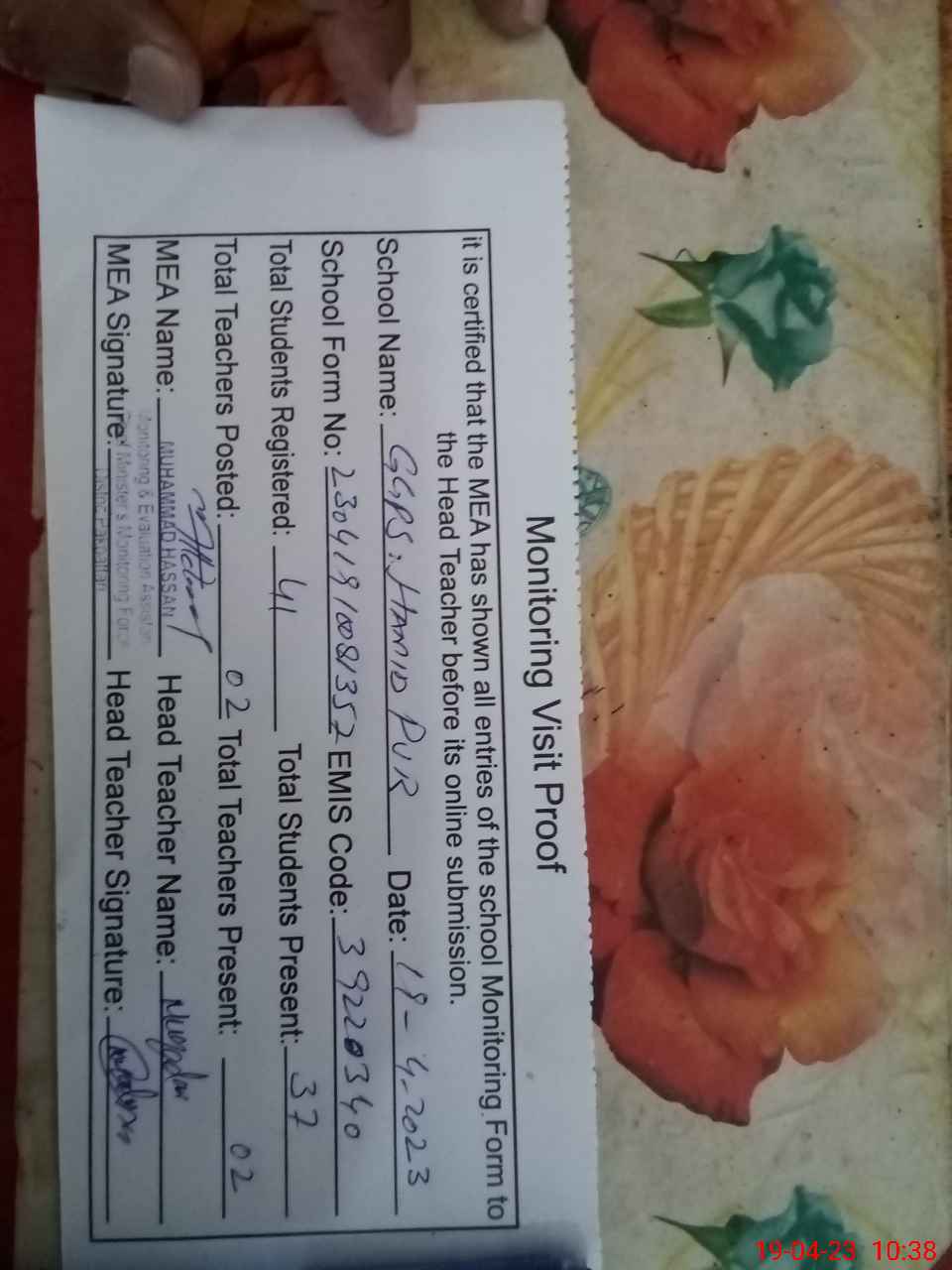 | Attendance Register | Head Teacher | MEA with School | Visit Proof |