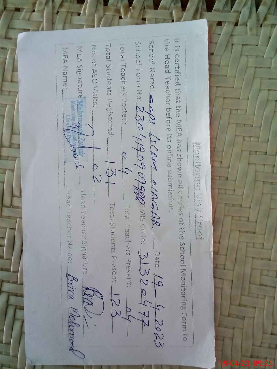 | Attendance Register | Head Teacher | MEA with School | Visit Proof |