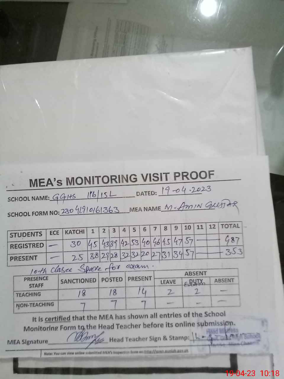 | Attendance Register | Head Teacher | MEA with School | Visit Proof |