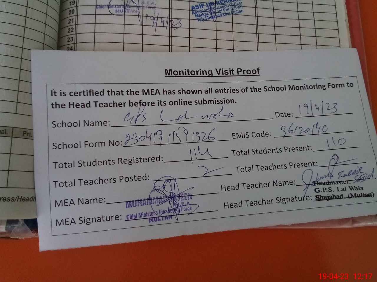 | Attendance Register | Head Teacher | MEA with School | Visit Proof |
