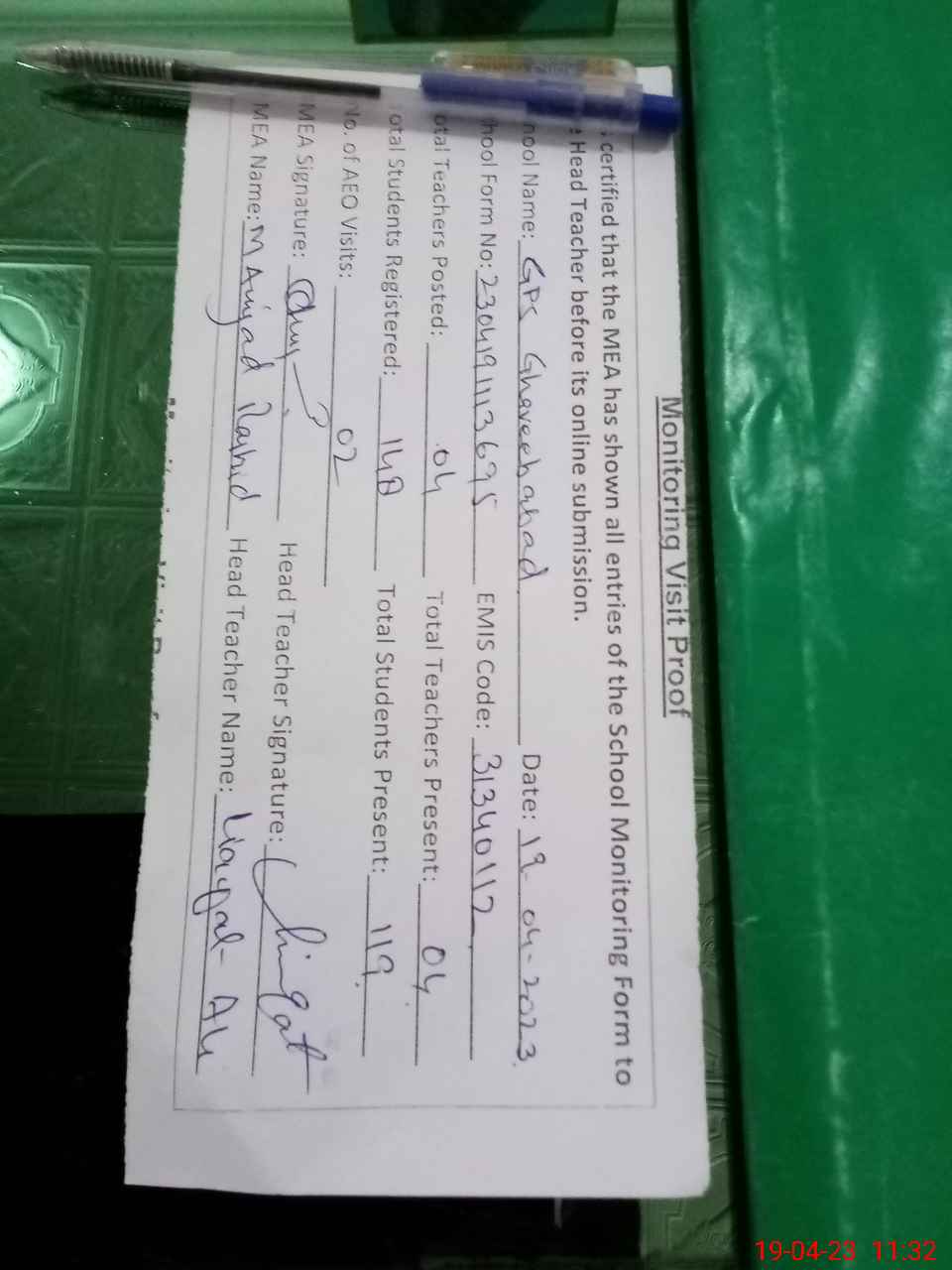| Attendance Register | Head Teacher | MEA with School | Visit Proof |