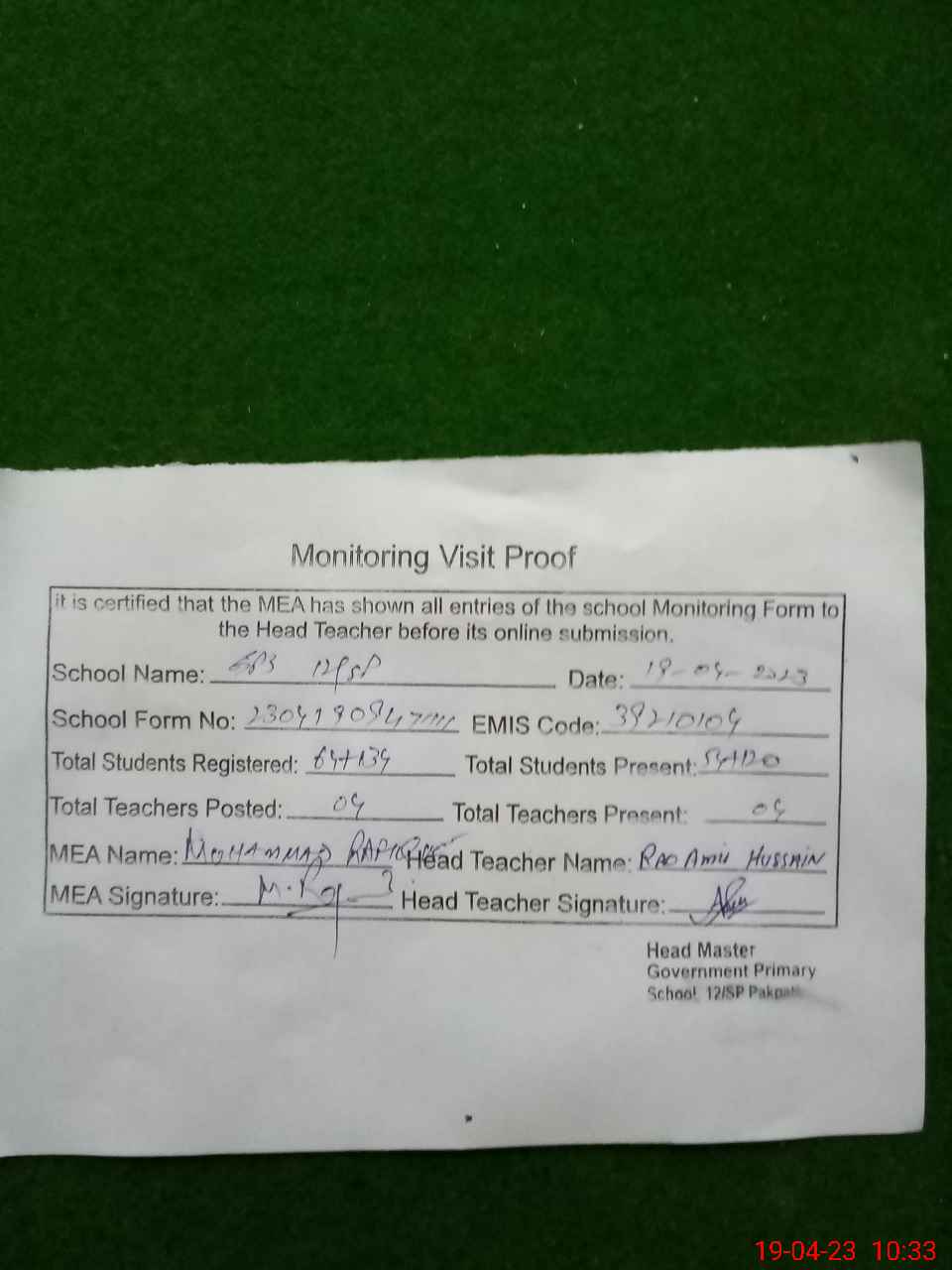 | EMIS Code: 39210104 | Name of School: GPS 12/SP P.O 8.S.P PAKPATTAN | |||
