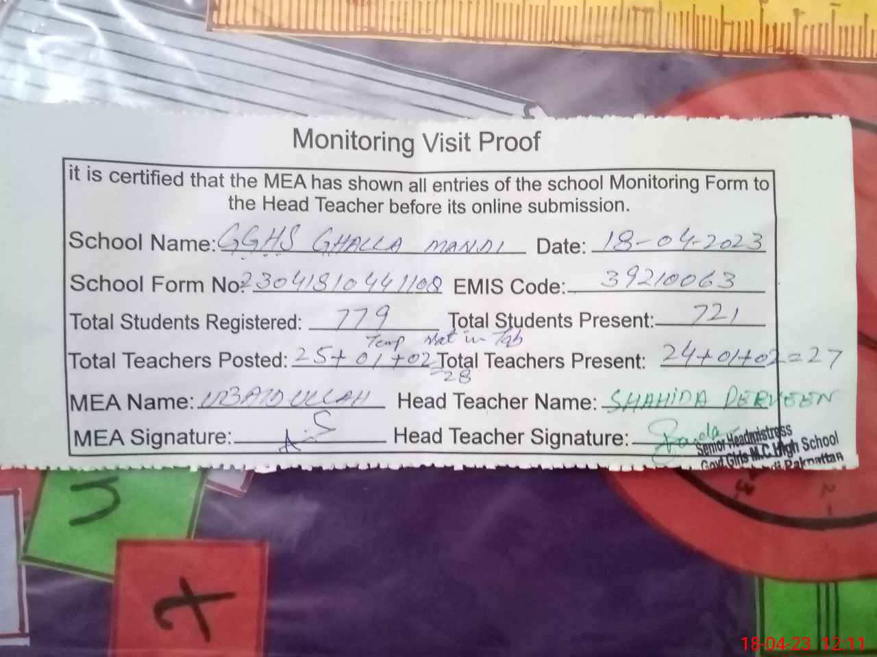 | Attendance Register | Head Teacher | MEA with School | Visit Proof |