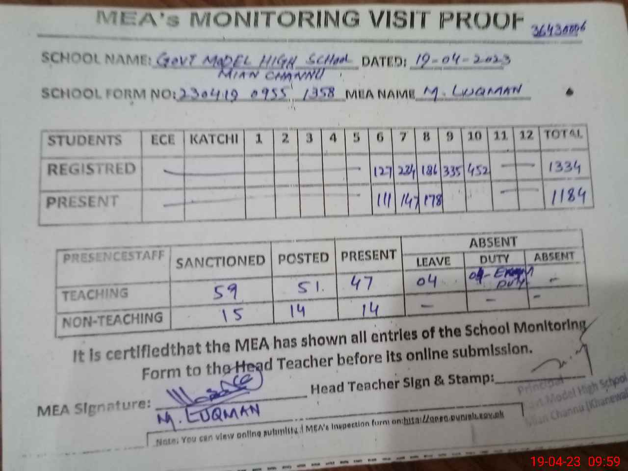 | Certified that this School was Inspected by the Undersigned MEA/DMO Today and the Information Stated Above is as Per Record. | |||||