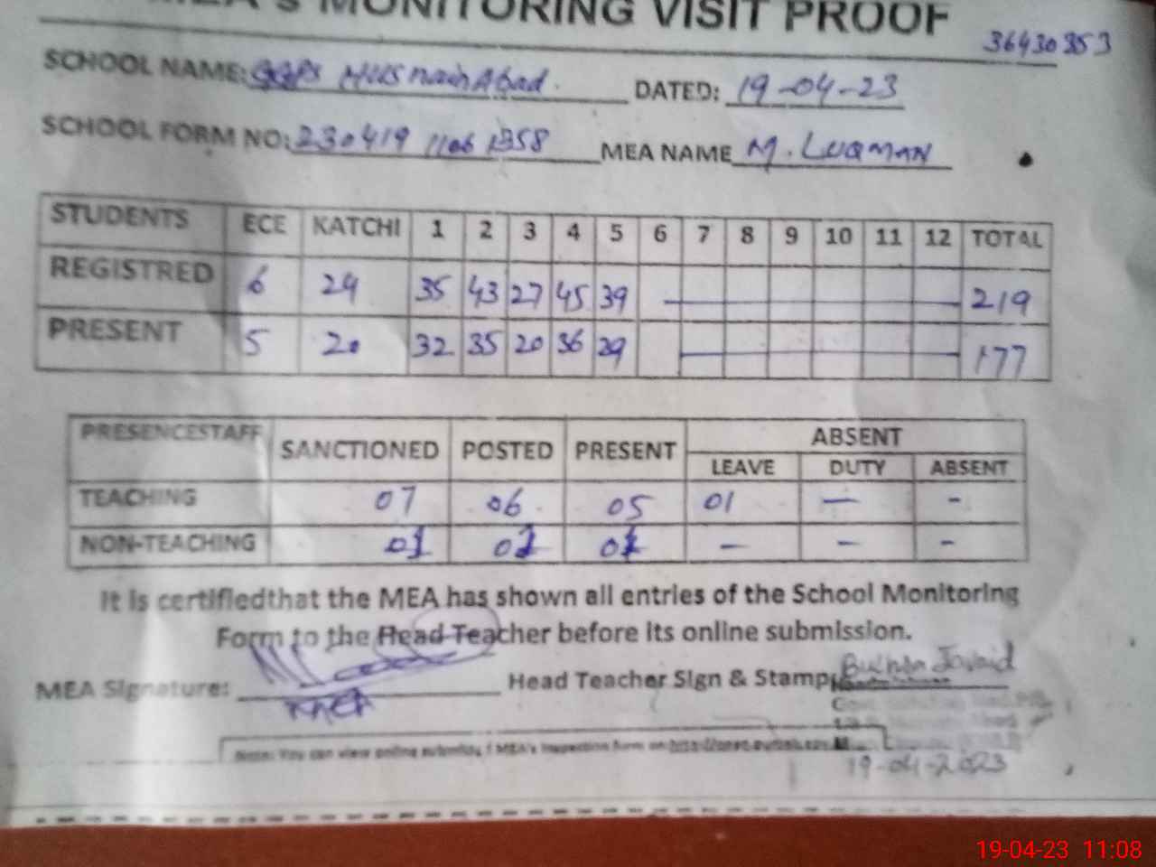 | Attendance Register | Head Teacher | MEA with School | Visit Proof |
