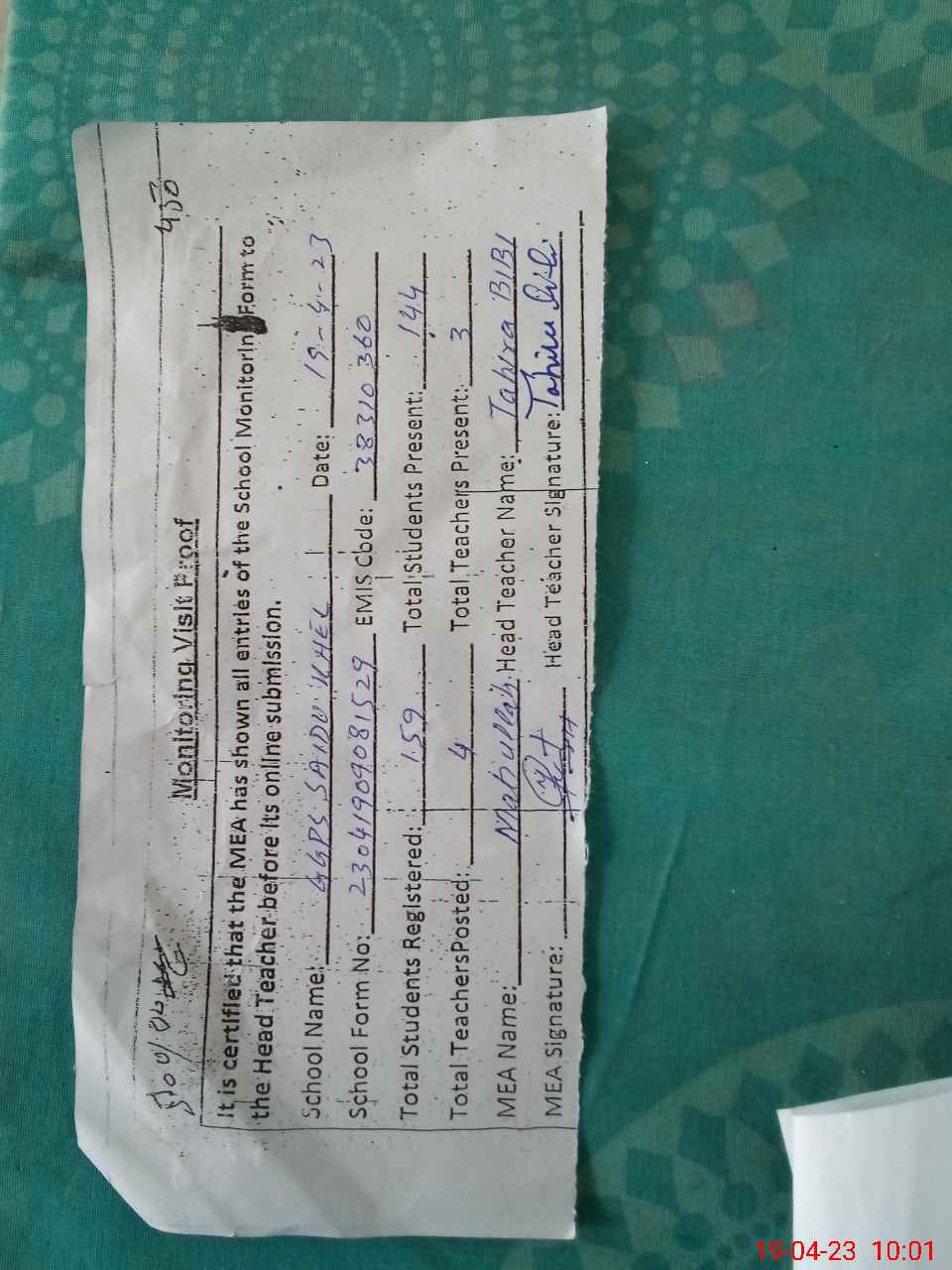 | Attendance Register | Head Teacher | MEA with School | Visit Proof |