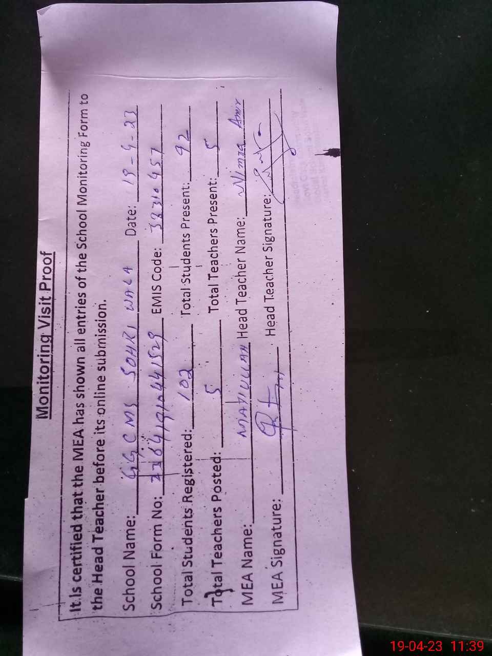 | Attendance Register | Head Teacher | MEA with School | Visit Proof |