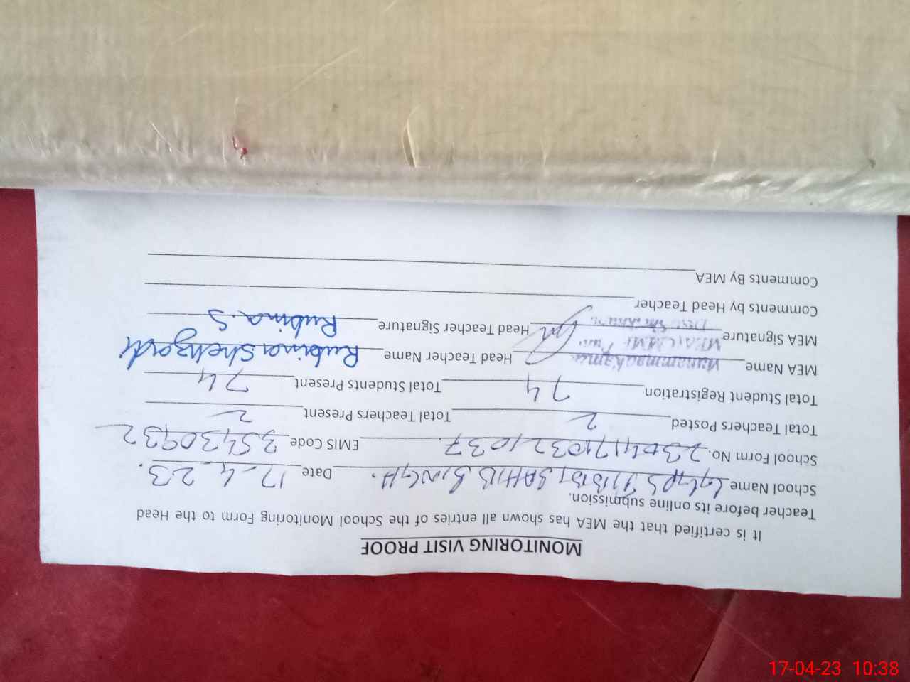 | Attendance Register | Head Teacher | MEA with School | Visit Proof |