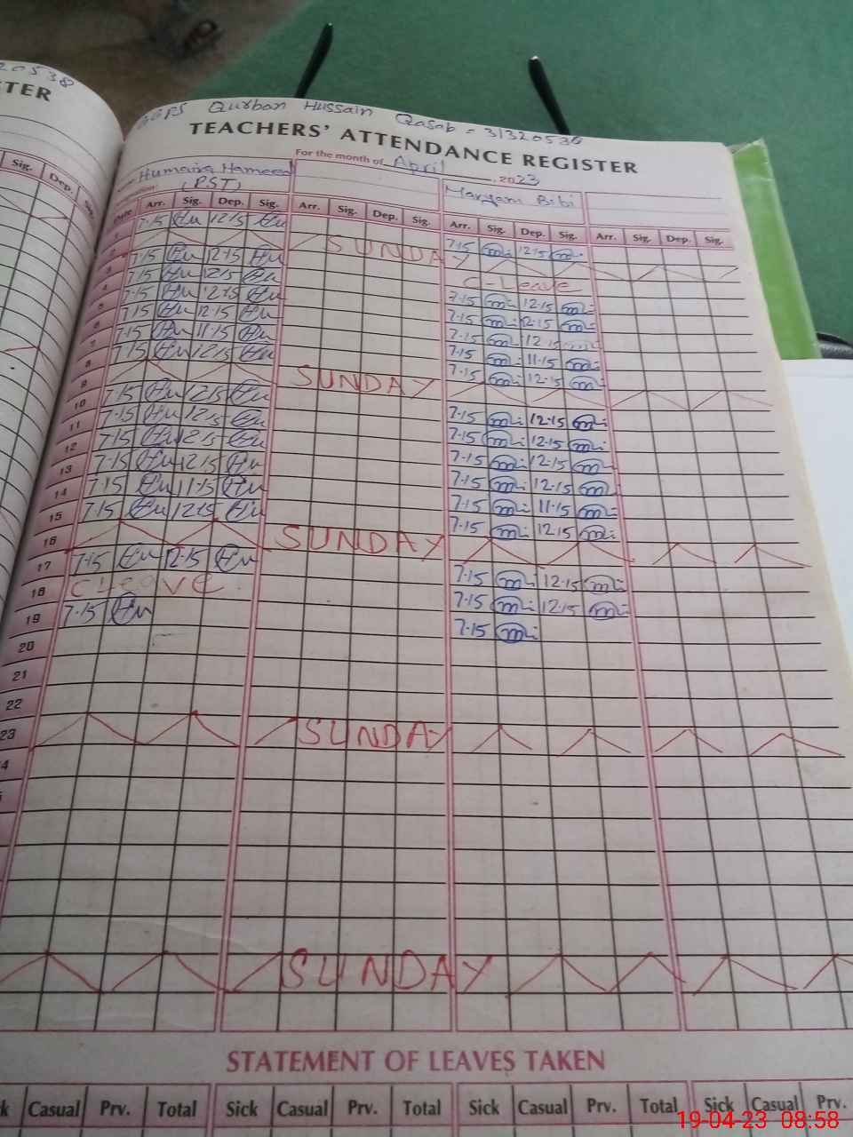 | CNIC | Full Name | Designation | R/C | Absence During Last Calender Month |