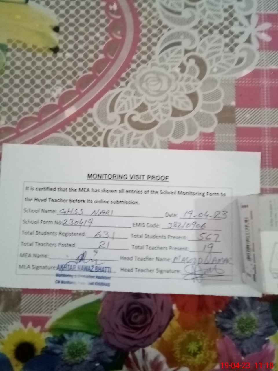 | Attendance Register | Head Teacher | MEA with School | Visit Proof |