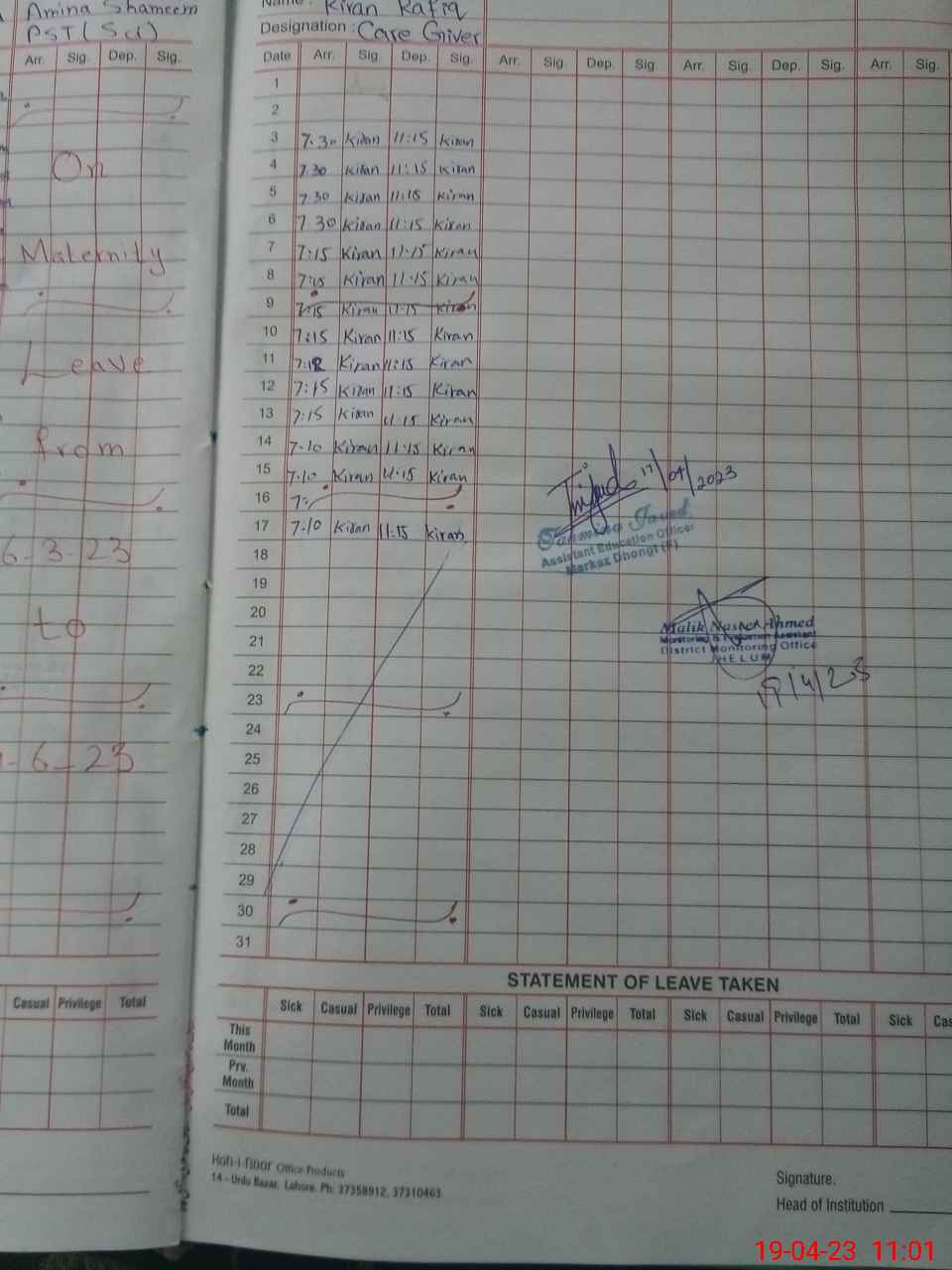 | 37**** | Am**** Sh**** | PST | Regular | 26 | 0 | 0 | 26 | 0 | 0 | 0 | 0 | 0 | Maternity |