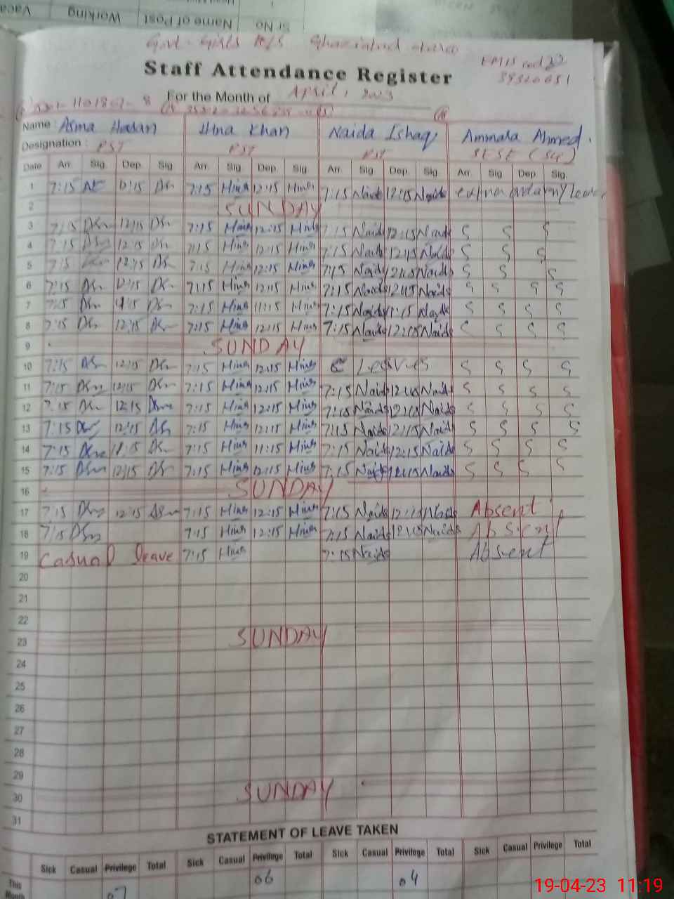 | Remarks (Use Separate Page if Required): Ms Ammara Ahmad SSE Sci is posted at GGHS Ghazi Abad His named in not add in MEA record She is absent without leave wef 03 April 2023 | |||||