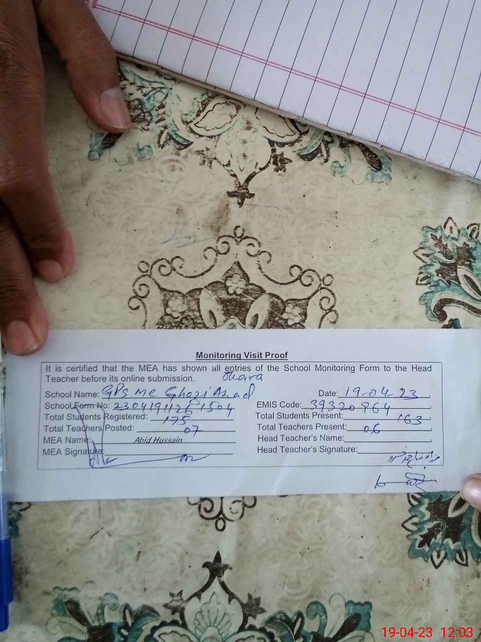 | Attendance Register | Head Teacher | MEA with School | Visit Proof |