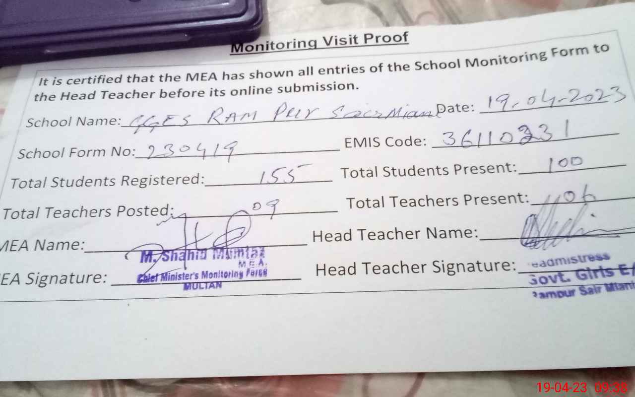 | EMIS Code: 36110231 | Name of School: GGES RAM PUR SAIR MIANI MULTAN | |||