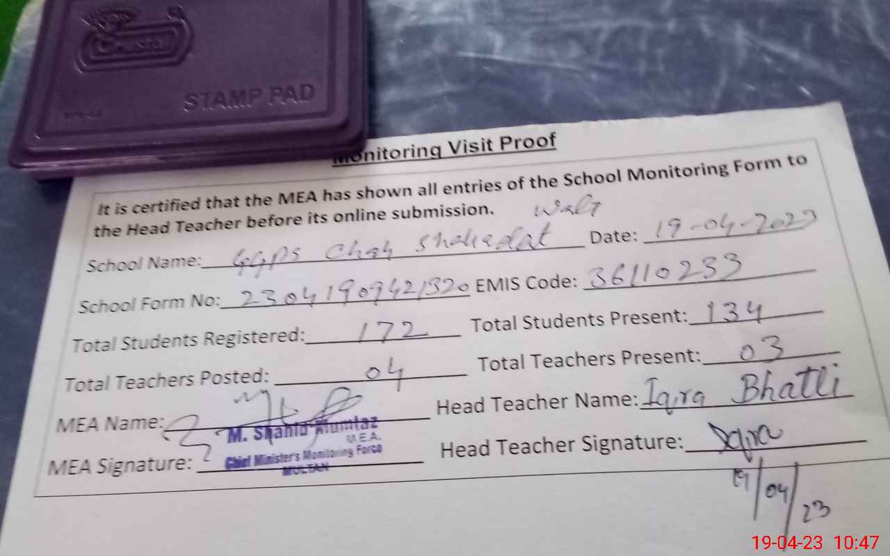 | EMIS Code: 36110233 | Name of School: GGPS CHAH SHAHADAT WALA MULTAN | |||