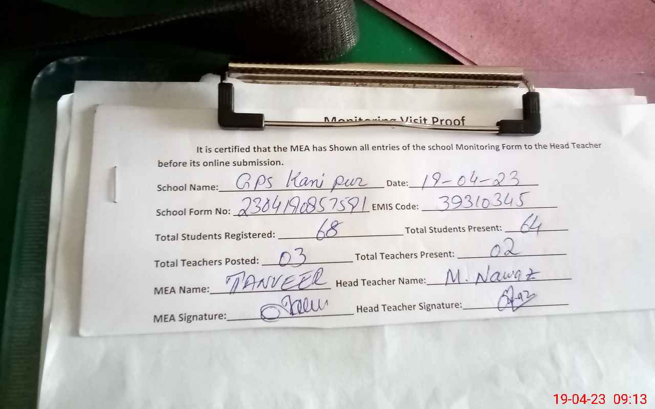 | Attendance Register | Head Teacher | MEA with School | Visit Proof |