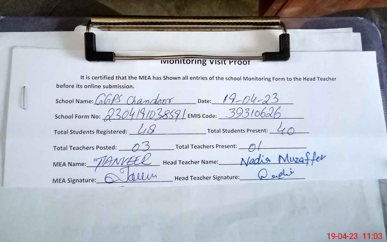 | EMIS Code: 39310626 | Name of School: GGPS CHANDOOR VIA BASEER PUR | |||