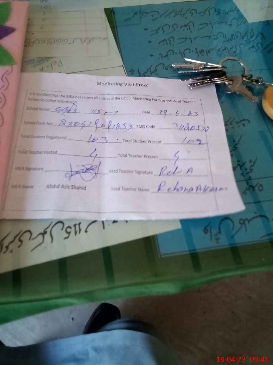 | Attendance Register | Head Teacher | MEA with School | Visit Proof |