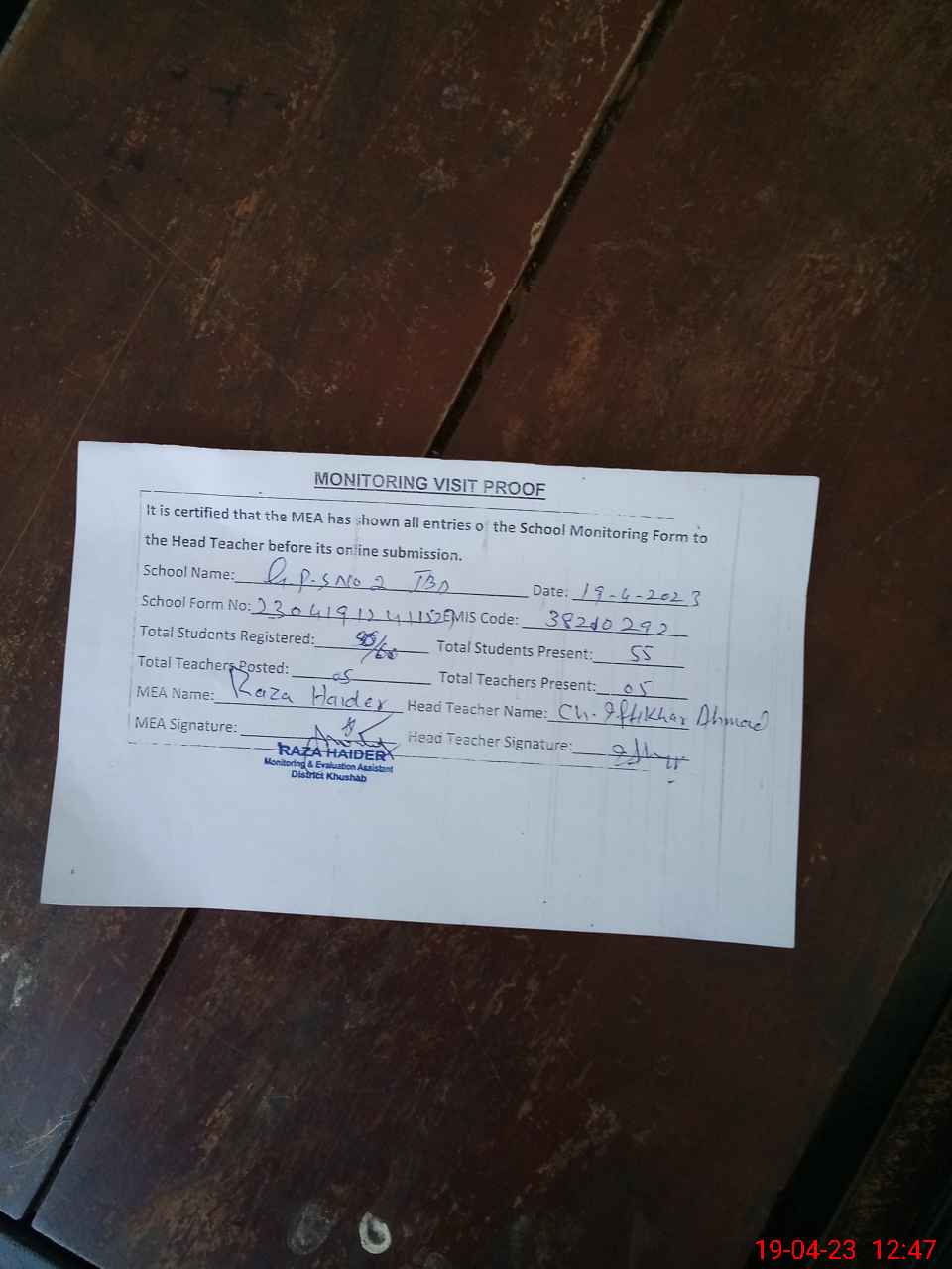 | Attendance Register | Head Teacher | MEA with School | Visit Proof |