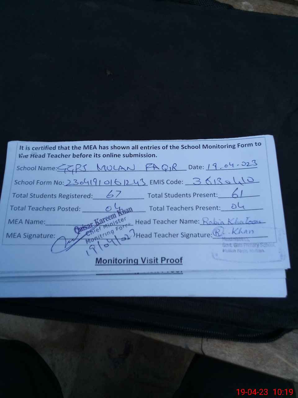 | Attendance Register | Head Teacher | MEA with School | Visit Proof |