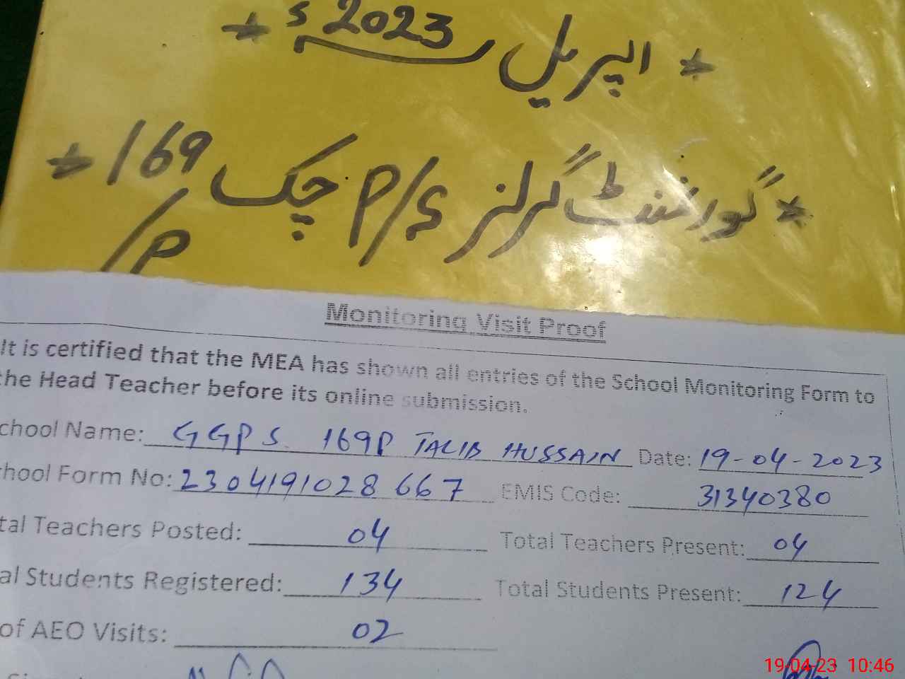 | EMIS Code: 31340380 | Name of School: GGPS TALIB HUSSAN CHAK NO. 169/P | |||